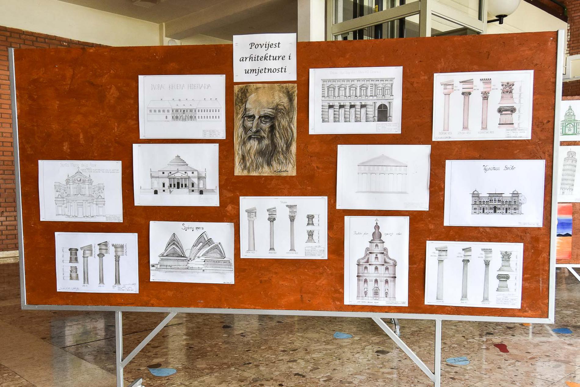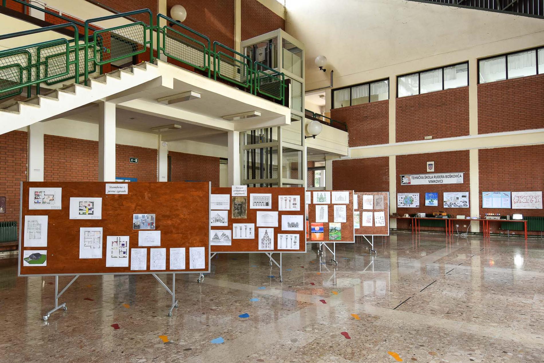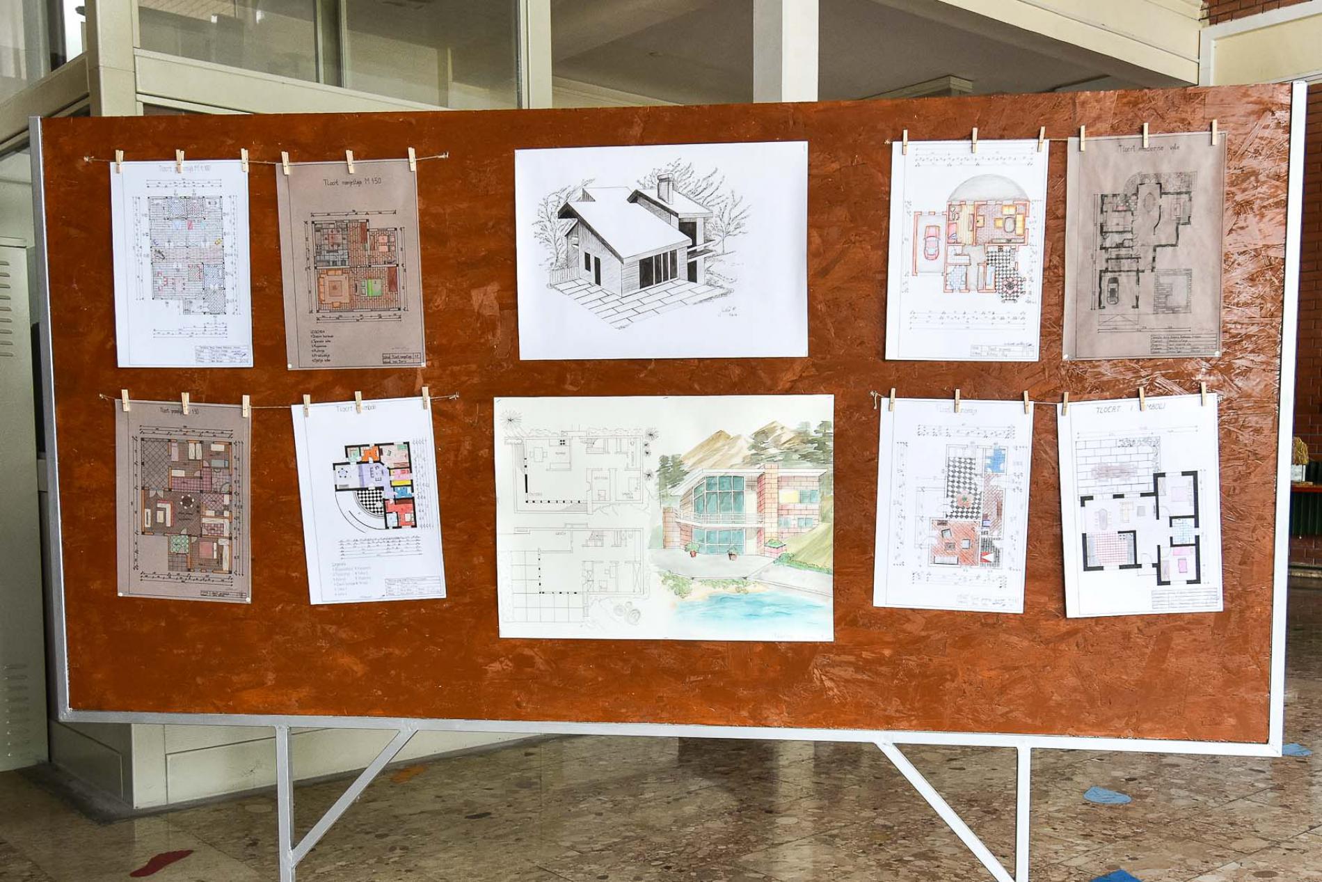U prostorijama škole su prikazane makete, panoi, plakati, crteži, nacrti,...